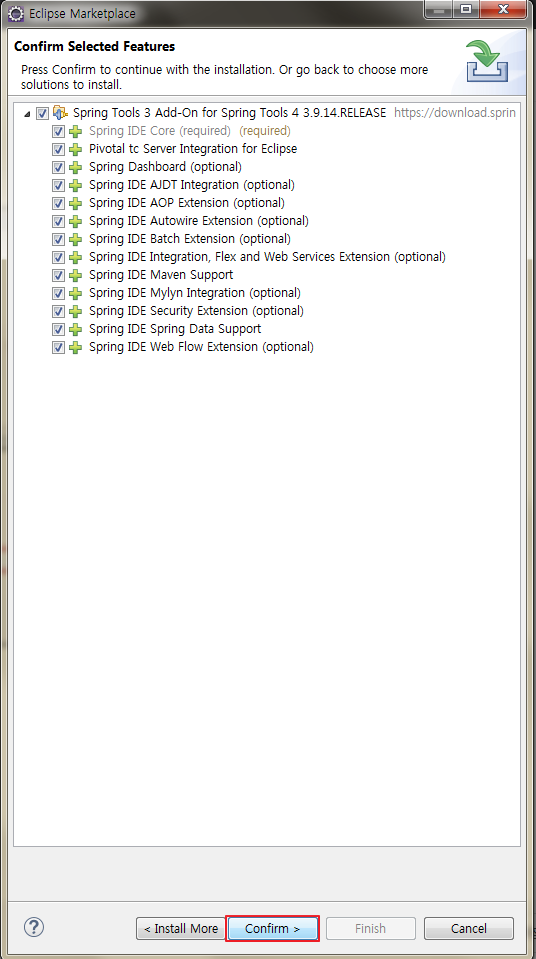 3. 모든 항목 체크하고 넘어가서 설치하면 됩니다. 설치가 끝나면 이클립스가 재시작이 되고 설치가 완료 됩니다.