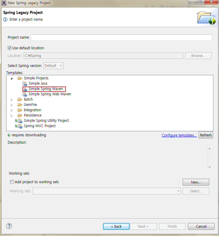2. Simple Spring Maven 선택하고 Project name은 편한대로 설정하고 Finish