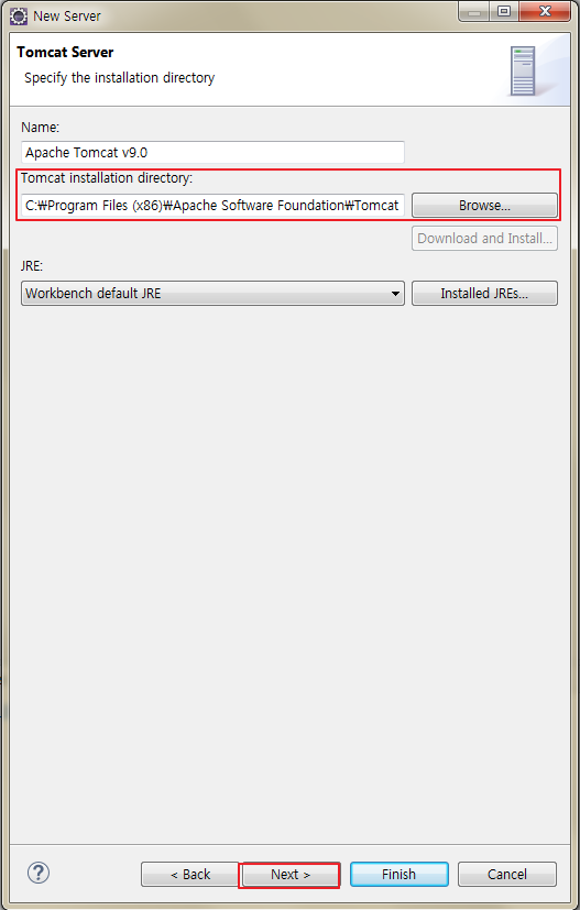 2. tomcat 설치되어 있는 경로 잡아주고 finish 하면 됩니다 ( next 할필요 x )