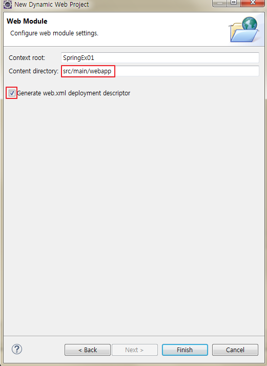 4. Content directory 설정하고 체크박스 체크하고 Finish ( 지금까지 만든 폴더/파일 이름은 고정으로 지정해주어야 합니다. )
