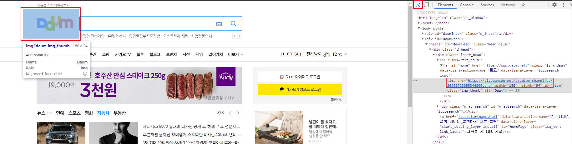 2. 왼쪽 위 마우스버튼을 누르면 현재 마우스가 위치하고 있는 곳이 코드의 어느부분인지 확인할수 있습니다. Daum페이지 로고에 마우스 올려놓고 img경로를 확인하고 복사합니다.