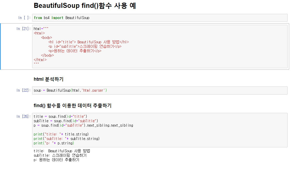 <h1 id="title"> BeautifulSoup 사용 방법</h1>