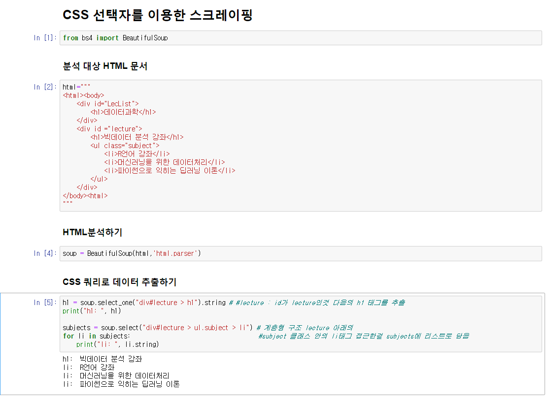 select(): lecture아래의 subject 클래스안의 li태그 접근한값을 subjects에 리스트로 담음