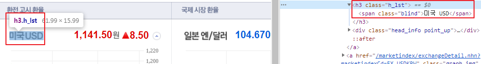 개발자 도구(f12)로 내용을 확인해보면 <h3.h_list> 태그 내에 <span.blind>태그 내에 내용이 들어있는것을 확인할 수 있습니다. 미국USD말고 다른것들도 다 똑같은 태그와 클래스를 사용하기 때문에 select() 메소드를사용해 list로 result 변수에 저장해줍니다.