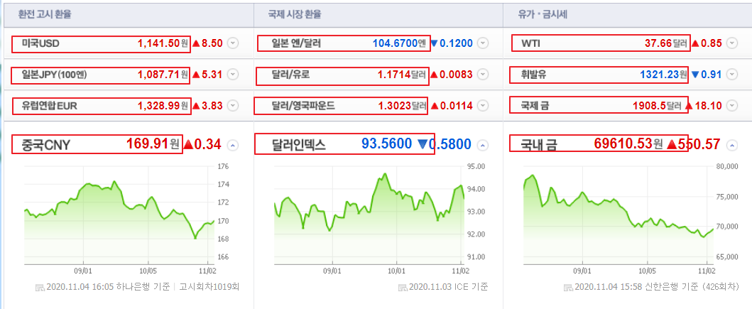 환전 고시 환율 2020.11.04 16:05 하나은행 기준 고시회차 1019회