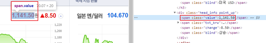개발자 도구(f12)로 내용을 확인해보면 <h3.h_list> 태그 내에 <span.blind>태그 내에 내용이 들어있는것을 확인할 수 있습니다. 미국USD말고 다른것들도 다 똑같은 태그와 클래스를 사용하기 때문에 select() 메소드를사용해 list로 result 변수에 저장해줍니다.