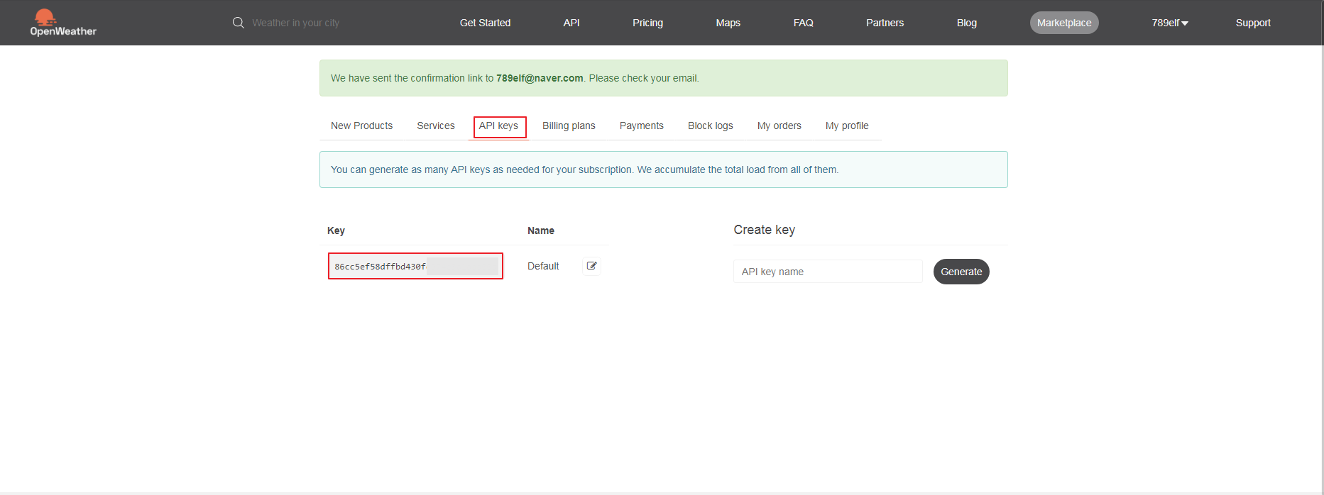 위의 사이트에서 회원가입을 하고 아래 사진에 보이는 API Keys를 클릭합니다.