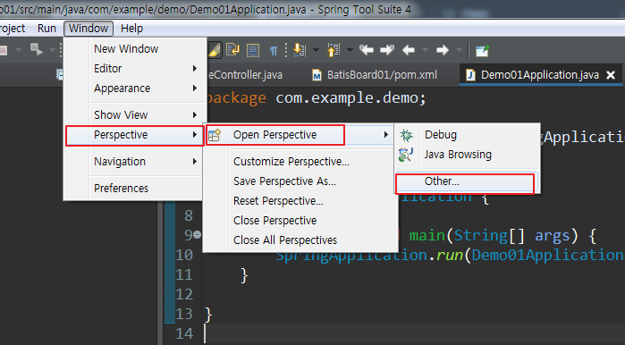 1. Windows -> Perspective -> Open Perspective -> Other....
