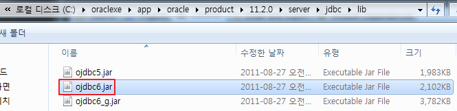 ojdbc6 기본 경로 : C:\oraclexe\app\oracle\product\11.2.0\server\jdbc\lib ( 오라클 설치경로마다 다름 )