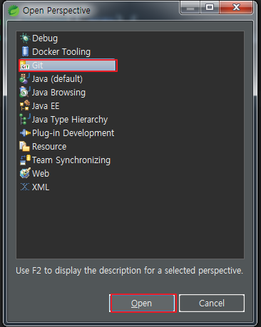 2. Git -> Open ( 여기까지 하면 이클립스 우측 상단에 Git 아이콘이 생기게 된다. )