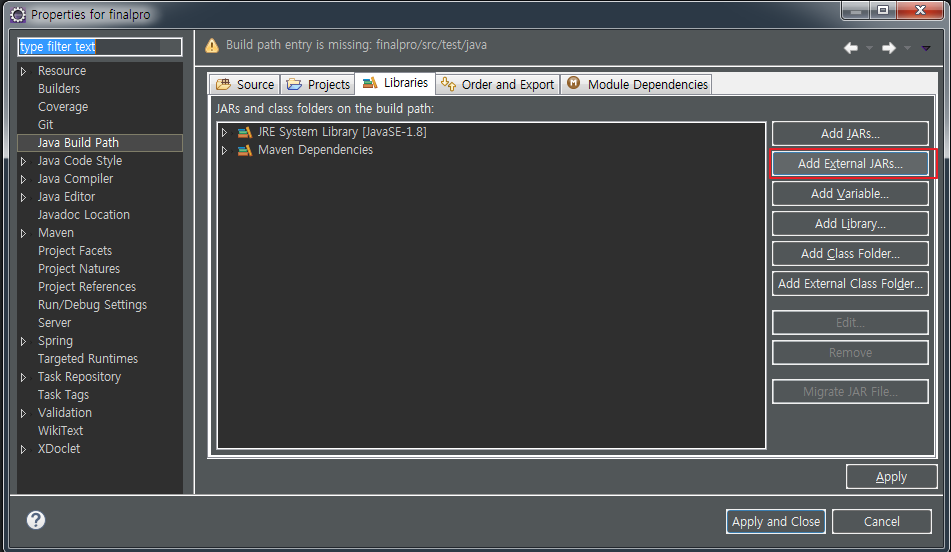 깃에서 프로젝트를 가져왔더니 ojdbc6이 자동으로 불러와지지 않아서 수동으로 추가하는 방법