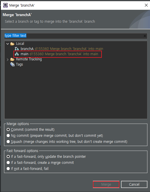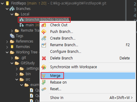 1. 병합하고 싶은 (병합 될) 브랜치 우클릭 -> Merge