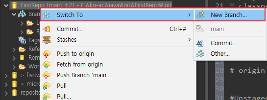 Git Repositories 우클릭 -> switch To .. -> New Branch -> branch 이름 정하고 finsh