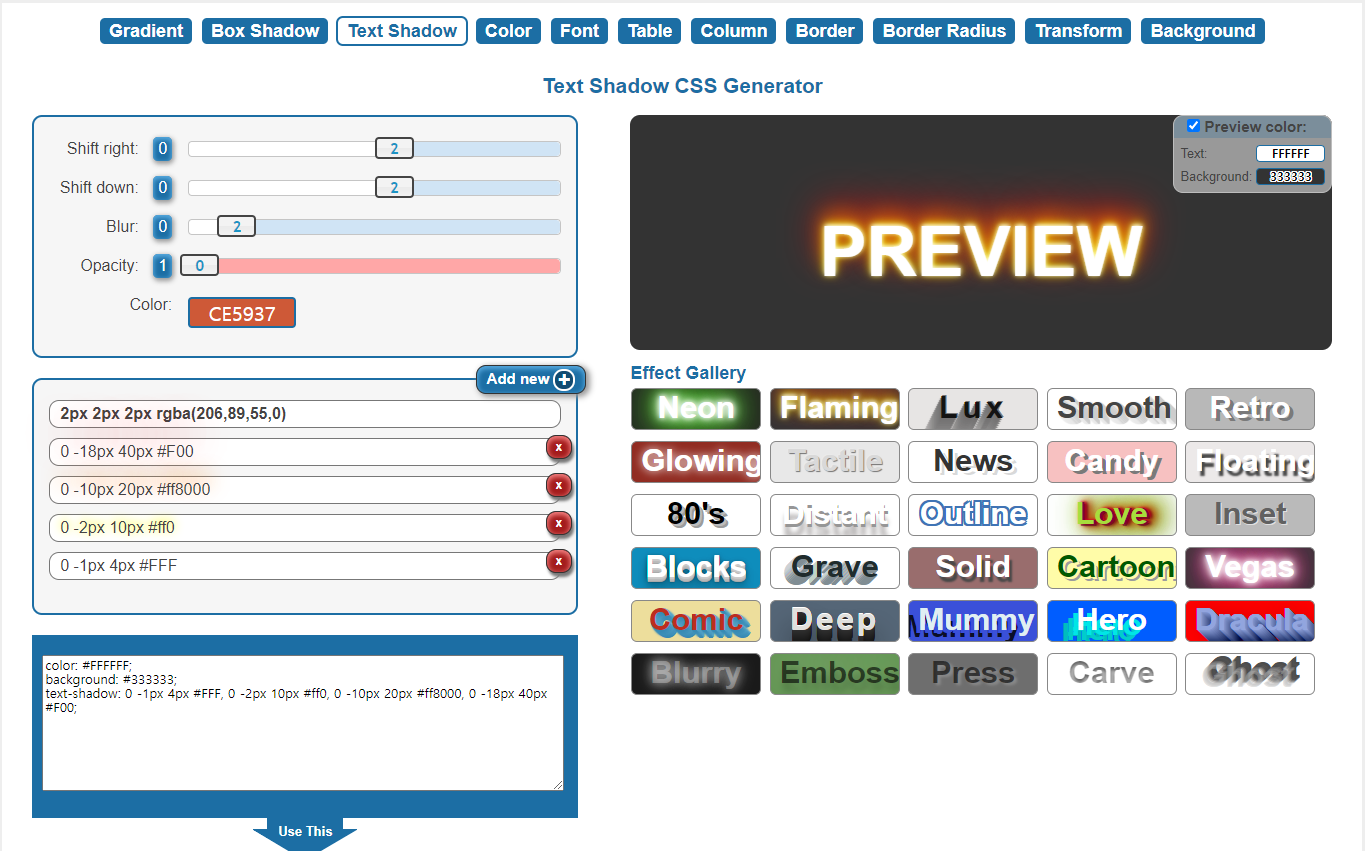 Pick a predefined style from the gallery or generate a text shadow with your preferences. Set up the desired attributes to get the CSS code.