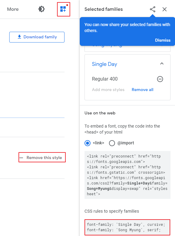 2. 맨 위에 오른쪽 아이콘을 눌러보면 장바구니처럼 여러개의 글꼴을을 한번에 import 할 수 있는 url이 추가 되어 있고, 글꼴도 추가되어 있는것을 확인할 수 있다.
