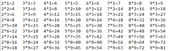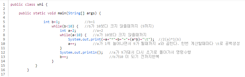 * System.out.print(j+"*"+i+"="+(j*i)+"\t"); // \t: space bar