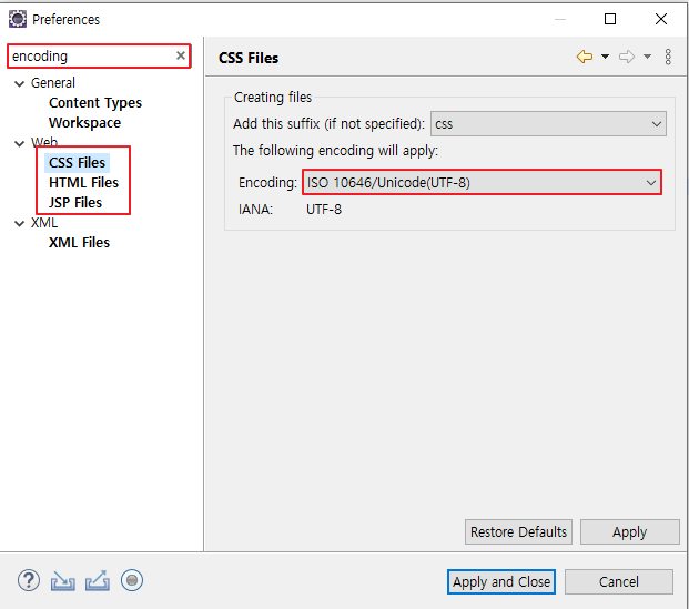 이클립스 window -> Preferences -> encoding검색 -> Web 내부의 CSS, HTML, JSP 파일의 인코딩을 UTF-8로 변경