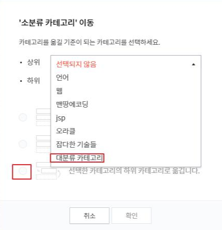 - "선택한 카테고리의 하위 카테고리로 옮깁니다" 선택