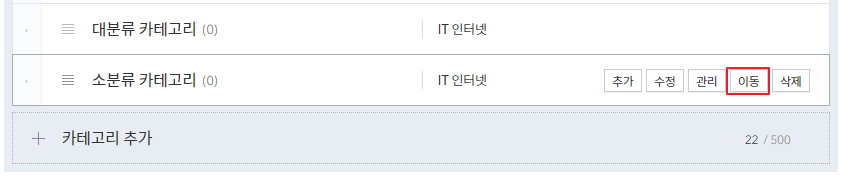 이동 시키고 싶은 카테고리에 마우스를 올리면 저렇게 5가지 버튼이 나옵니다.