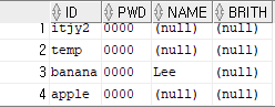그럼 id에는 itjy2, pwd에는 0000이 입력되게 된다. (단 테이블 뒤에 괄호안에 필드 순서대로 값이 들어가는것을 주의 )