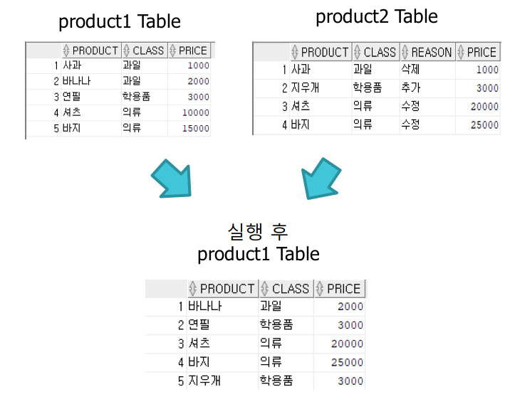 insert values (p2.product, p2.class, p2.price); -- 같지 않을경우 사용될 명령어