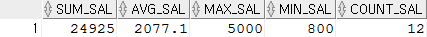 SELECT SUM(SAL)SUM_SAL,ROUND(AVG(SAL),1) AVG_SAL, MAX(SAL)MAX_SAL,MIN(SAL) MIN_SAL, COUNT(*) COUNT_SAL