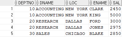 SELECT DEPTNO, D.DNAME, D.LOC, E.ENAME,E.SAL