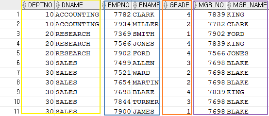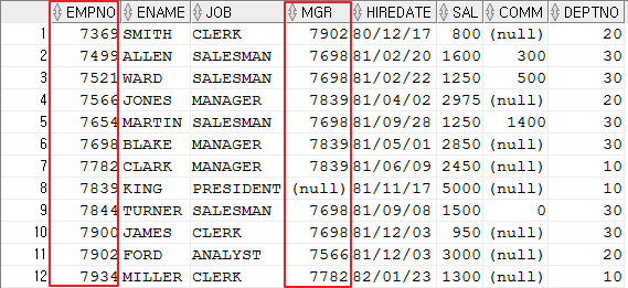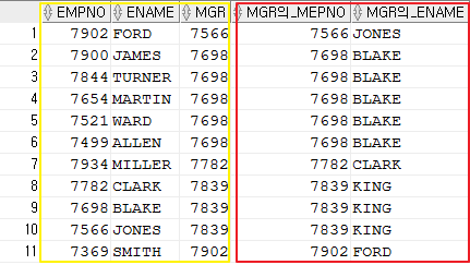 노란 부분이 E1, 빨간부분이 E2의 정보입니다. 첫 행을보면 FORD의 직속상관의 사번과 이름까지 한 행에 출력되는 것을 확인 할 수 있습니다.