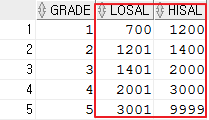 WHERE E.SAL BETWEEN S.LOSAL AND S.HISAL;