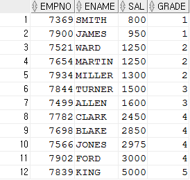=> BETWEEN 조건을 사용하여 SAL 컬럼의 값이 LOSAL ~ HISAL값 사이에 있으면 그 값에 해당하는 GRADE가 붙게 됩니다. 조건을 사용하게 될 경우 조건에 맞는 행 끼리 하나의 행으로 합쳐지게 됩니다.