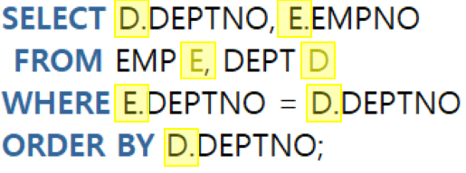 위의 테이블을 보면 EMP 테이블의 별칭을 E, DEPT 테이블의 별칭을 D 로 지정을 해주었습니다.