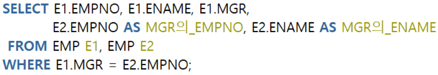 하나의 테이블을 여러개의 테이블과 같이 사용하기 위해 EMP테이블의 별칭을 E1, E2 두개를 생성했습니다.