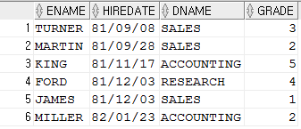 AND 부분부터는 JOIN 문법입니다. 비등가조인, 등가조인 두개를 사용하였고 HIREDATE를 오름차순 정력하여 최종적으로 끝나게 됩니다.