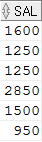 그래서 SAL이 1600,1250,250,1500,950 보다 큰 모든 조건이 만족했을경우에만 출력합니다.